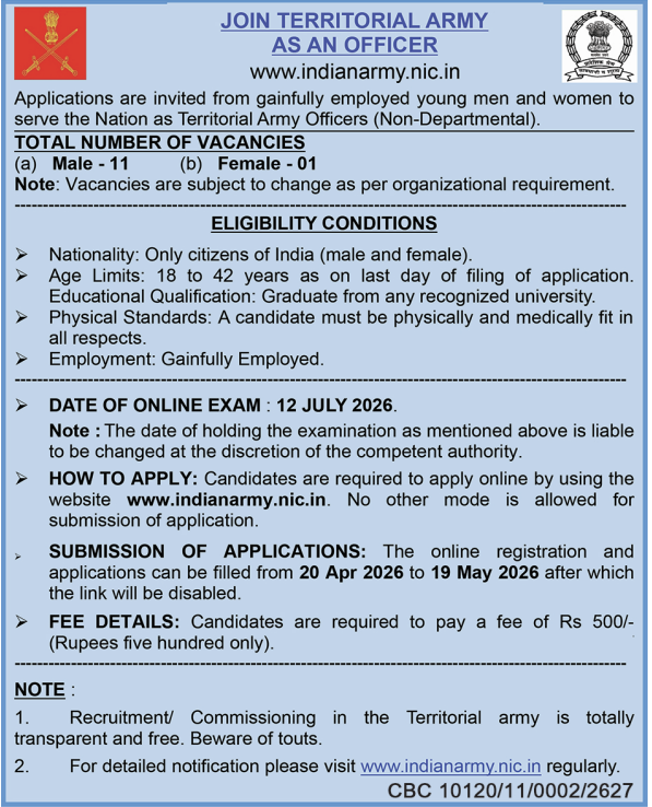 Indian Army (Territorial Army) has released the official notification for recruitment of Territorial Army Officers (Non-Departmental). Gainfully employed young men and women who wish to serve the Nation can apply online within the prescribed dates.