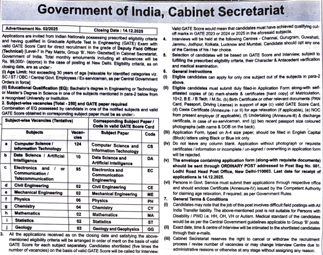 The Cabinet Secretariat, Government of India, invites applications from eligible Indian citizens for recruitment to the post of Deputy Field Officer (Technical) under Advertisement No. 02/2025. Applications are invited from candidates with valid GATE scores in relevant subjects. Applicants must submit their forms offline within the prescribed dates mentioned below.Total Vacancies: 250 posts.Discipline-wise Vacancies:Computer Science / IT – 124 posts (GATE: CS) Data Science / AI – 10 posts (GATE: DA) Electronics / Communication – 95 posts (GATE: EC) Civil Engineering – 2 posts (GATE: CE) Mechanical Engineering – 2 posts (GATE: ME) Physics – 6 posts (GATE: PH) Chemistry – 4 posts (GATE: CY) Mathematics – 2 posts (GATE: MA) Statistics – 2 posts (GATE: ST) Geology – 3 posts (GATE: GG) Age Limit:Maximum 30 years as on 14 December 2025.Relaxations applicable for SC, ST, OBC, PwBD & Ex-servicemen as per Government rules.Educational Qualification:Candidates must possess:B.E. / B.Tech degree OR Master’s Degree (Science / relevant technical discipline)from a recognized university, with a valid GATE score (2023/2024/2025). Selection Process:Shortlisting based on GATE Score Interview Pay Scale:Level-7 of 7th CPC — Approx. ₹99,000 per month including allowances.Application Process:Candidates must send the A-4 size application form along with self-attested copies of documents (certificates, marksheets, GATE scorecard, caste certificate, NOC for Govt. employees) to:Post Bag No. 001, Lodhi Road Head Post Office, New Delhi – 110003Important Date:Last date for receipt of application: 14 December 2025Other Details:Applicants will be liable for All-India Transfer.No application fee is requiredApply Link: